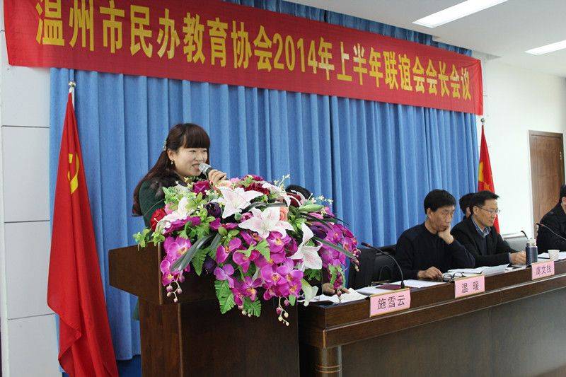 会议于上午9点准时在瑞祥高级中学四楼会议室举行。会议由温州民办教育协会教科研部主任施雪云主持,共分四个议程。会议第一项议程由瑞祥高级中学副董事长、副校长温暖代表校董事会、全体师生向与会的会长致欢迎词。她向大家介绍了学校的基本情况和发展现状。瑞祥高级中学现有34个教学班,1500余人,教职工120人,是国家民办教育综合改革首批试点学校,窗口学校。学校这两年各方面都取得了显著的进步,如高考在第三批的生源前提下,取得了本科突破25%和上线率90%的好成绩,被评为瑞安市教学质量奖。此外她还谈了自己的几点感受,希望大家要学会感恩教育局婆家和民办教育协会娘家、珍惜兄弟学校的缘分,并要对民办教育的自身发展充满信心。